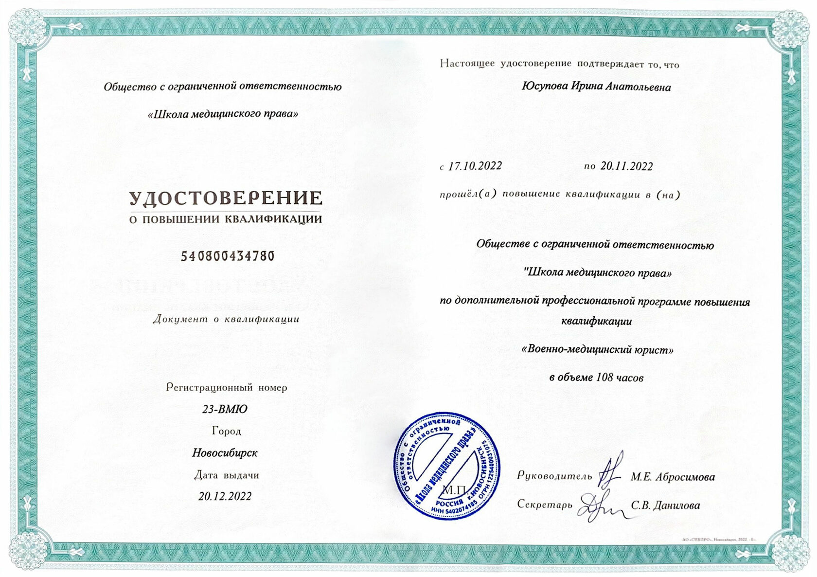 В 2022 году окончила курсы «Секреты создания медицинских документов» и курс «Военно-медицинский юрист».