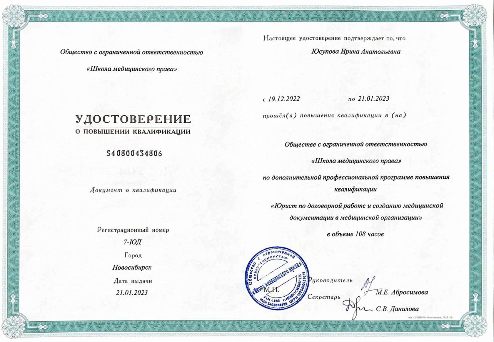 В 2023 году окончила курс «Юрист по договорной работе и создаю медицинской документации в медицинской организации».